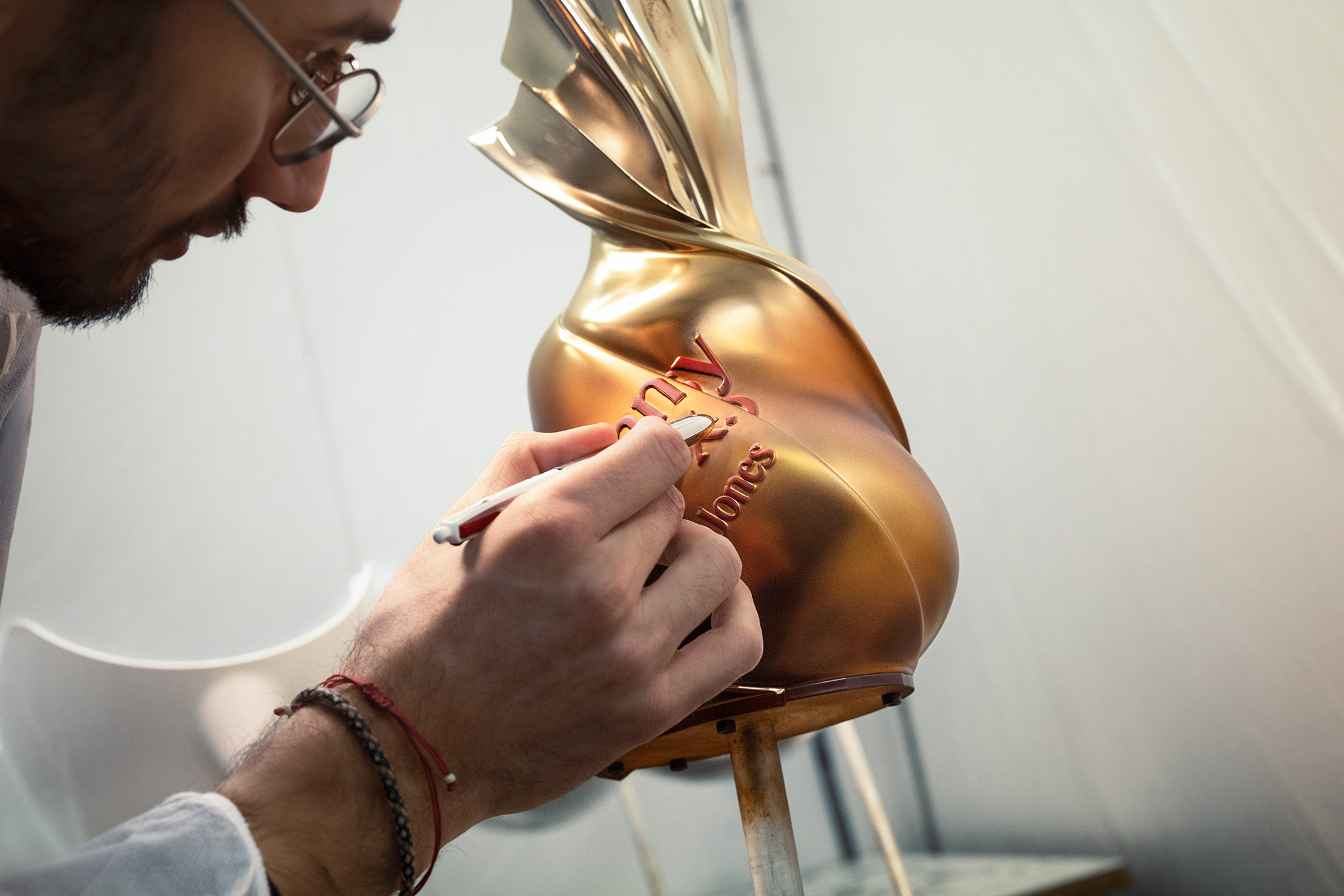 轩尼诗 X.O金·琼斯大师典藏版酒樽采用 3D 打印技术制作并经过手工精心润饰而成,全球限量仅 200 樽。酒樽紧贴酒瓶曲线将其包裹于内,表面的褶皱设计让人不禁联想到高级时装垂坠呈现的柔美线条。这一设计细节可以追溯到 20 世纪初,当时轩尼诗酒瓶也曾被小心翼翼地手工包裹在薄纸中,以保护其羊皮纸酒标。「从全新典藏版的设计中,你可以感受到那种来自高级时装的垂坠感。我希望可以将时尚融入到另一个全新领域中。」金·琼斯说道。「与运动鞋的设计类似,酒樽采用渐变色设计,灵感源自调配轩尼诗 X.O 时,不同年份的『生命之水』深浅不一的色泽。
