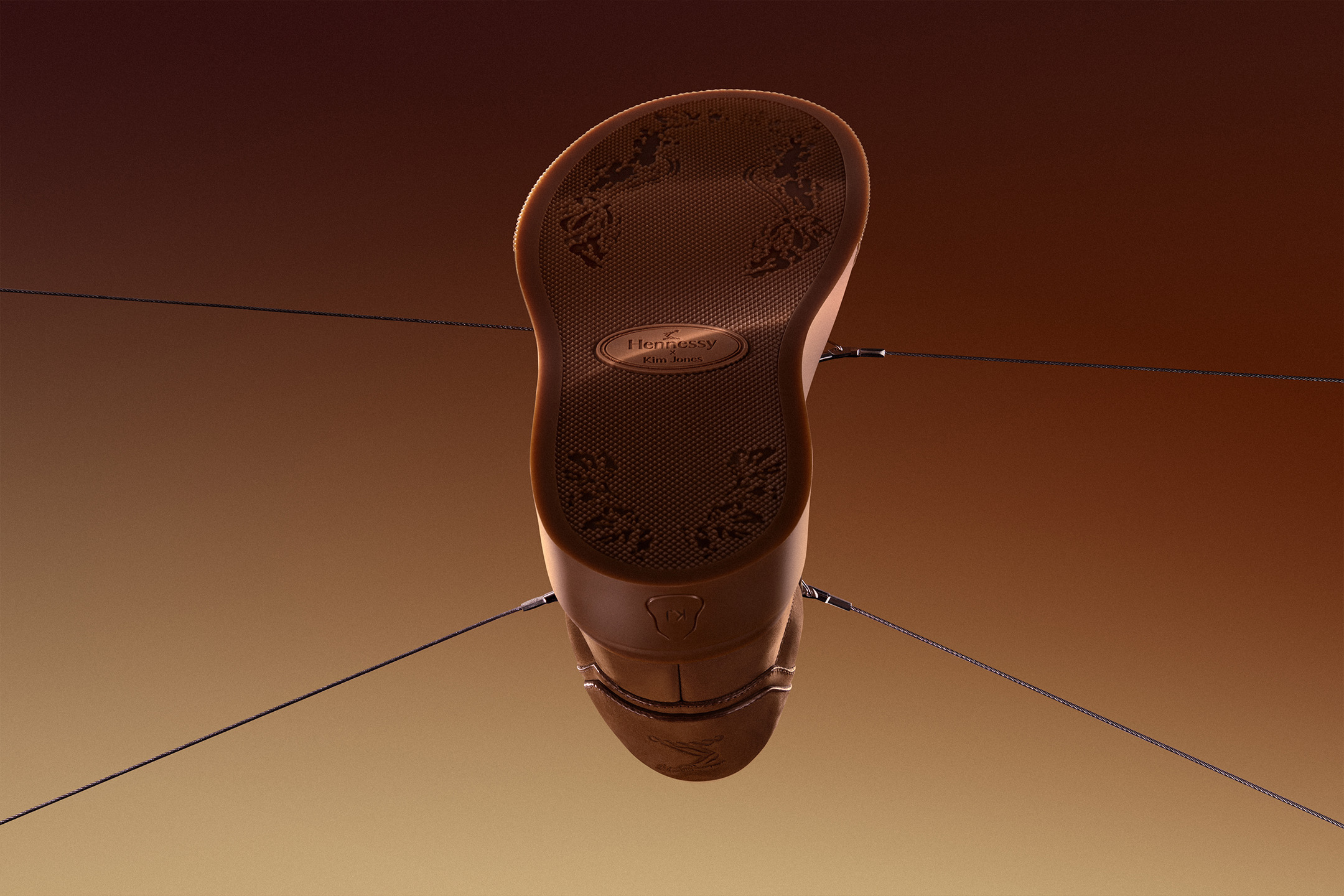 为了呈现干邑的琥珀色调,限量版运动鞋鞋面使用了褐色正绒面革,鞋跟处低调点缀着设计师姓名首字母「KJ」和富有传奇色彩的轩尼诗家族战斧标志。除此之外,皮革中底也使用了与酒樽曲线相同的轮廓,并延伸至大底的凹槽。
